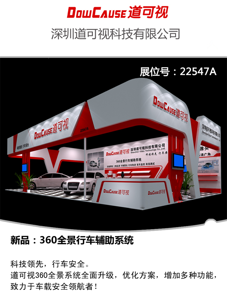 2015年1月16日,第十一屆深圳國際汽車改裝服務(wù)業(yè)展覽會盛大開幕,迎來了國內(nèi)各地的參展商和采購商。深圳道可視科技有限公司精心準(zhǔn)備的各種展品在展會現(xiàn)場獲得了市民以及采購商的一致好評。特別是我們的360度全景泊車影像系統(tǒng)備受關(guān)注,受到了各界人士的駐足。這一次我們主要的展品有360度全景泊車影像系統(tǒng)、智能倒車軌跡、專車專用攝像頭。這三類展品是我們公司專門針對汽車電子行業(yè)設(shè)計生產(chǎn)的主打產(chǎn)品,不僅在國內(nèi)屬于獨創(chuàng),在國際上也是具有較強(qiáng)競爭力。