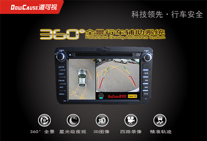 道可視360全景影像系統(tǒng)通過(guò)前后左右的四路攝像頭采集四周圖像,經(jīng)過(guò)無(wú)縫拼接后在原車(chē)屏實(shí)時(shí)形成360度全景俯視圖和前后左右的單視圖。車(chē)主可以清晰直觀(guān)的掌握周邊路況,不留一線(xiàn)視野盲區(qū),將一切盲區(qū)交通事故扼殺在發(fā)生之前。