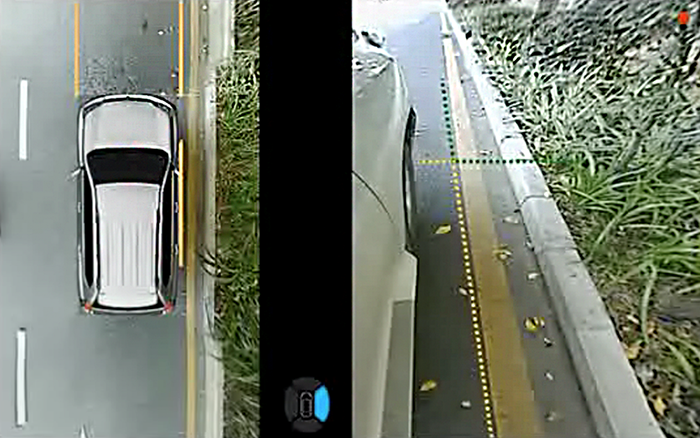 針對(duì)這一場(chǎng)景,道可視的“停靠路崖模式”在倒車檔模式下開啟雙閃時(shí),會(huì)將車身兩側(cè)(整個(gè)車身、前后輪、踏板等)同時(shí)顯示,以這種近場(chǎng)垂直的鳥瞰圖顯示方式,配合安全參考線(與車身距離為20CM),有效的解決了??柯费聲r(shí)可能對(duì)輪胎及輪轂造成刮傷的問題。